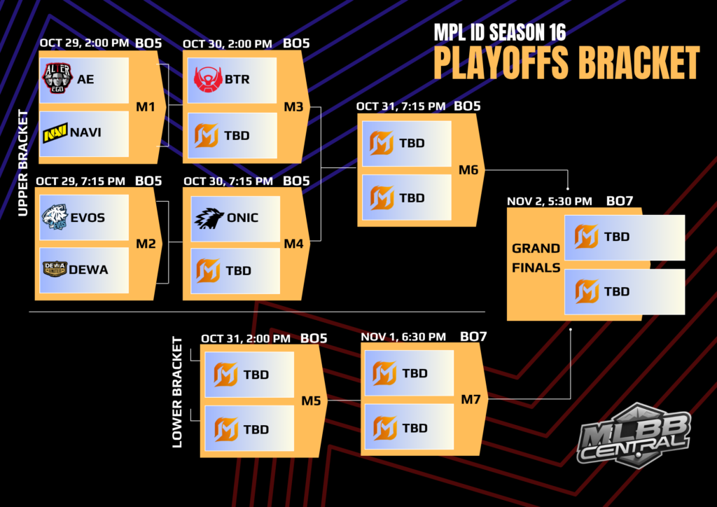 MPL ID S16 Schedule Leave a Comment / By MLBB Central / October 22, 2025 DAY 1 DAY 2 DAY 3 DAY 4 DAY 5 October 29, 2025 | 2:00 PM GMT +8 2:00 pm N/A Alter Ego Esports vs NAVI – Best of 5 October 29, 2025 | 7:15 PM GMT +8 7:15 pm N/A EVOS vs DEWA United Esports – Best of 5 October 30, 2025 | 2:00 PM GMT +8 2:00 pm N/A Bigetron Alpha vs TBD – Best of 5 October 30, 2025 | 7:15 PM GMT +8 7:15 pm N/A ONIC vs TBD – Best of 5 October 31, 2025 | 2:00 PM GMT +8 2:00 pm N/A TBD vs TBD – Best of 5 October 31, 2025 | 7:15 PM GMT +8 7:15 pm N/A TBD vs TBD – Best of 5 November 1, 2025 | 6:30 PM GMT +8 6:30 pm N/A Final Lower Bracket: TBD vs TBD – Best of 7 November 2, 2025 | 6:30 PM GMT +8 6:30 pm N/A Grand Finals: TBD vs TBD – Best of 7 Share this: Click to share on Facebook (Opens in new window) Facebook Click to share on X (Opens in new window) X Related